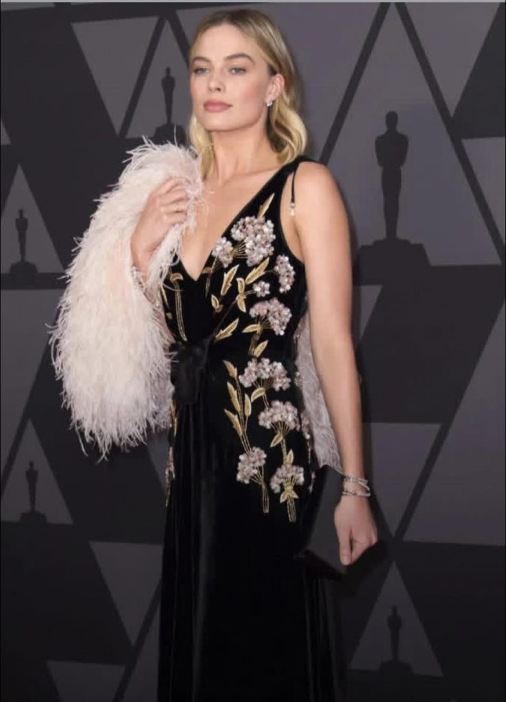 演紅「真人版芭比」的女星Margot Robbie 也是紅毯常客。2017年頒獎禮上,恰如其分地演繹這件融合1930與50年代風格的Altuzarra黑絲絨刺繡禮服,非常好萊塢派風情。