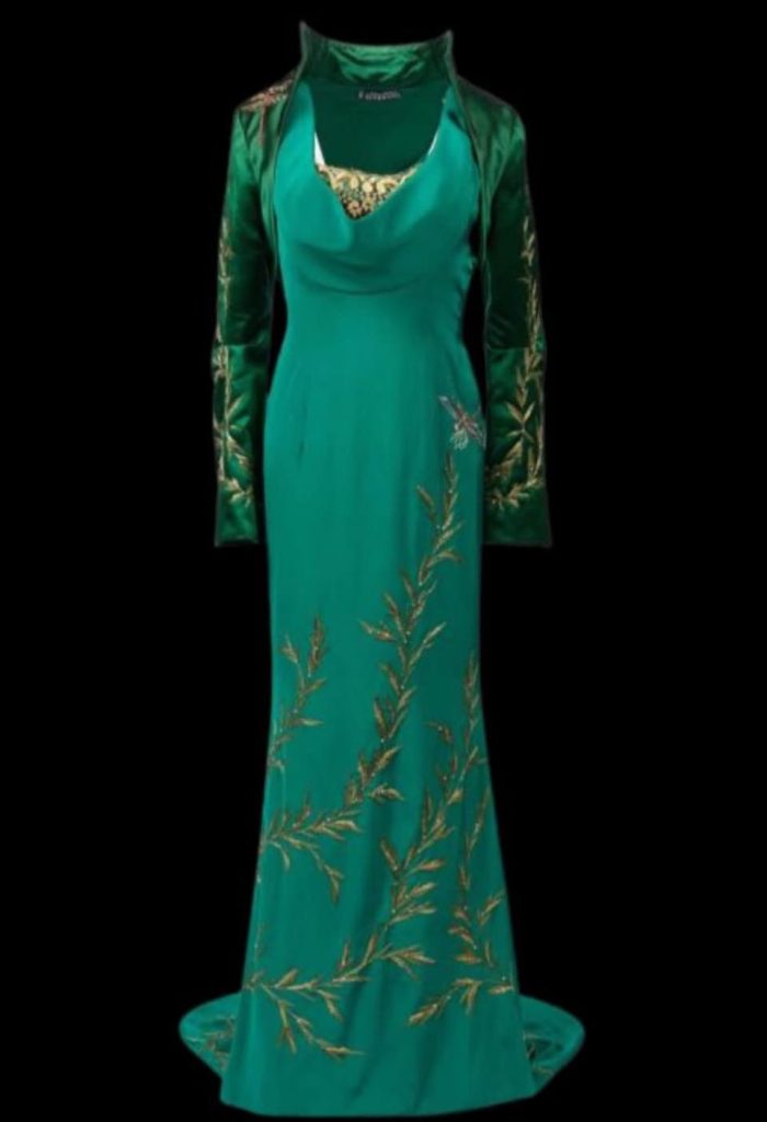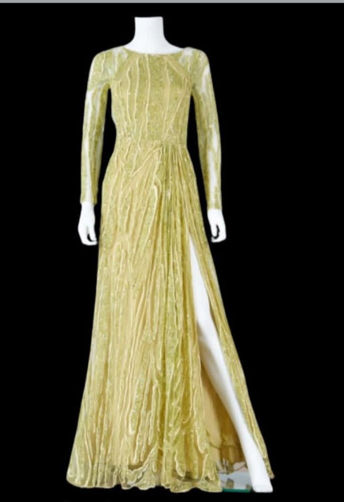 這件由已故設計鬼才 Alexander McQueen 操刀設計,點綴著金色手工刺繡與水晶珠飾的絲綢禮服,於2023年以12,700美元成交。
