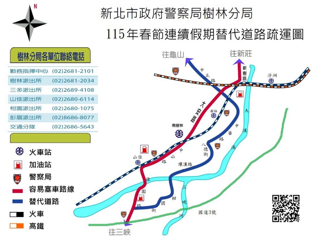 樹林分局十四日表示,新北市樹林區115年春節連續假期前「博愛街」傳統市場,「秀泰生活樹林店與家樂福」等商場與賣場,易湧現年貨採買人(車)潮,針對保安街一段、博愛街、樹新路、鎮前街、大安路等路段,規劃編排警力及義交執行交通疏導管制。提醒用路人務必遵循道路交通標誌、標線、號誌之指示,並服從現場交通疏導人員之指揮,耐心通過壅塞路段,共維交通安全與行車秩序。