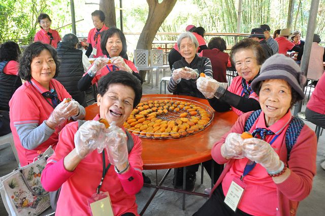 本次特別安排帶領學員至松年大學總校新竹聖經學院參觀,總校校長阮介民牧師、副校長及幹事熱情款待大家,學員們徜徉在優美的綠蔭草地微曬溫暖陽光及拍照,留下與聖經學院的美好紀錄。接續前往柿餅教育農場,體驗捏柿餅文化,每年九月至翌年一月在農園映入眼簾的盡是一幅幅詩情畫意的美景,黃橙橙的柿子置滿於棚架上,一顆顆金色小球正享受著日光浴,導覽員講解透過新竹特有的九降風與日曬,並融合傳統晒柿工藝,經陽光、風吹7~9天,以及烘烤、手工輕撫愛的按捏後,這些黃金般的小圓果實才會變化成金紅色的美味柿餅。這過程不僅創造了美食,更是一種生活態度,又如同松年大學的銀髮學員寶貴的人生經歷,愈沉愈香。