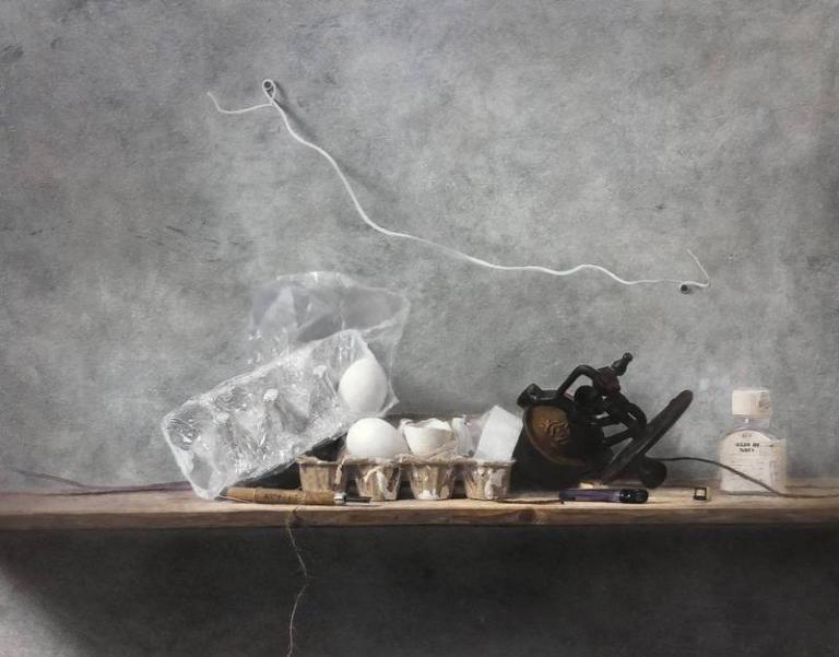 ▲玄奘大學藝創系學生張家豪【日常的隨意】油畫系列作品,勇奪聯邦新人獎首獎,獨得高額獎金40萬元。 (圖/記者蔣彤雲攝)