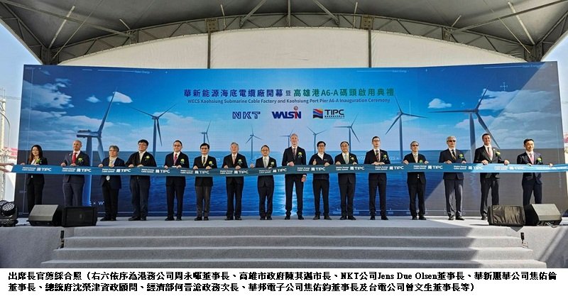 波新聞─李至文/高雄臺灣港務股份有限公司與華新麗華股份有限公司今(6)日共同舉辦「華新能源海底電纜廠開幕暨高雄港A6-A碼頭啟用典禮」,象徵南臺灣離岸風電產業鏈發展再度往前邁進,也為臺灣綠色能源產業寫下重要里程碑。港務公司在配合政府能源轉型政策上,積極推動離岸風電產業鏈佈局,透過整合洲際一期貨櫃中心A6場域逾30公頃土地並配合產業需求辦理高雄港洲際一期A6碼頭護岸及新生地填築計畫,斥資新臺幣30億元興建2座荷重30噸重件碼頭,奠定高雄港成為離岸風電國產化供應鏈的核心基地。華新麗華公司於111年進駐洲際一期A6-A場域,並與全球前三大丹麥NKT HV Cables AB集團攜手合作,在高雄港合資設立華新能源電纜系統股份有限公司,打造全臺首座海底電纜生產工廠,總開發面積約20公頃,投資金額逾新臺幣130億元,將可創造400個以上就業機會,同時也為南臺灣的生產技術升級、產業聚落與區域經濟帶來顯著助益。隨著國內離岸風場持續推動,臺灣港群從台中港的風機零組件製造基地及預組裝基地,到臺北港水下基礎製造基地到安平港的水下基礎備援儲轉用地,現在高雄港也加入成為離岸風電國產化供應鏈重要的一環,除了水下基礎製造外,也成為全台首座海底電纜廠生產及輸出的唯一基地,於行政院政策支持下,港務公司透過護岸及新生地填築於毗鄰海側區域填築新建碼頭,這不僅是港口利用創新思維,更是推動離岸風電產業在地化的重要工程,藉由技術累積與人才培育,高雄港將逐漸形成完整的產業部落,為未來臺灣能源計畫奠定更加穩固的基礎。港務公司周永暉董事長指出,在行政院與交通部的政策支持下,港務公司投入逾30億元辦理高雄港A6重件碼頭護岸及新生地填築工程,陸續填築約8公頃新生地,並將碼頭長度由原330公尺延長至421公尺,船席水深約13公尺,碼頭荷重可達每平方公尺30噸。另外港務公司在未來五年編列超過190億元全力投入高雄港建設,同時在高雄市長大力支持下,港務公司將與高雄市政府攜手合作共同帶動港市蓬勃發展。隨著離岸風電產業的蓬勃發展,高雄港洲際一期A6區為支援國內及亞太區域風場的重要基地。港務公司也期許以洲際一期A6-A產官合作成功案例,攜手華新麗華公司為臺灣能源轉型貢獻一份心力,並共同樹立綠能永續發展的里程碑,高雄港務分公司也承諾將持續提供更優質的經營環境,促進港市共榮發展,並為臺灣在亞太風電市場中爭取更多競爭優勢,成為長期發展離岸風電產業之核心基地。