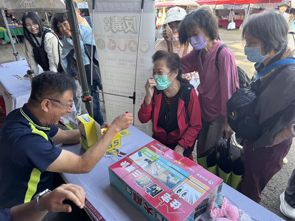 現場最受注目的,是志工以輕鬆活潑的方式帶領民眾進行「識詐打地鼠」小遊戲。志工以民眾最熟悉的詐騙場景現場示範,例如「假冒公務人員」、「解除分期付款」及經典的「親友遭綁票」話術,讓民眾在笑聲中快速記住詐騙關鍵字。雖然遊戲僅有一位玩家操作,周邊卻聚集不少民眾加油觀戰,形成另類宣導亮點。