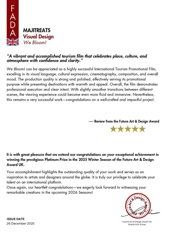 英國未來藝術與設計獎(Future Art & Design Award, FADA)為具國際指標性的藝術與設計獎項,聚焦於創意概念、敘事完整度與文化影響力,本次花蓮國際觀光形象影片獲得白金獎榮譽,象徵其在整體策展概念、影像語言與品牌敘事上,已具備與國際接軌的高度水準。