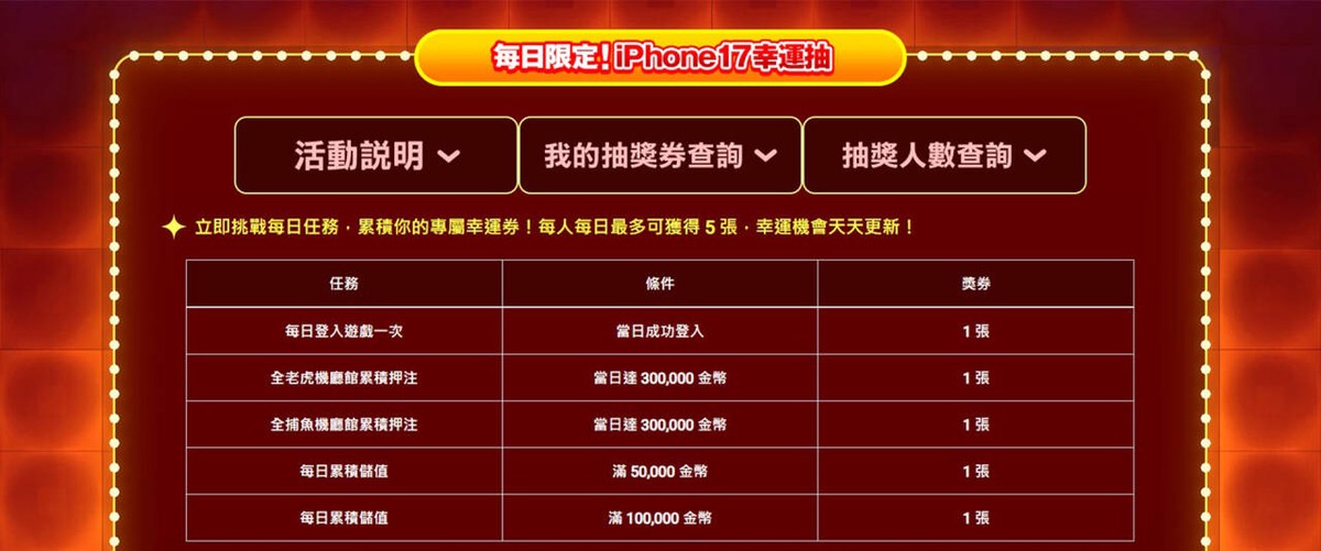 每日任務包含,登入遊戲、玩老虎機達指定門檻、玩捕魚機達指定門檻、儲值,其中只要1張抽獎券就可以抽iPhone 17,集滿5張就可以抽iPhone 17 Pro Max。