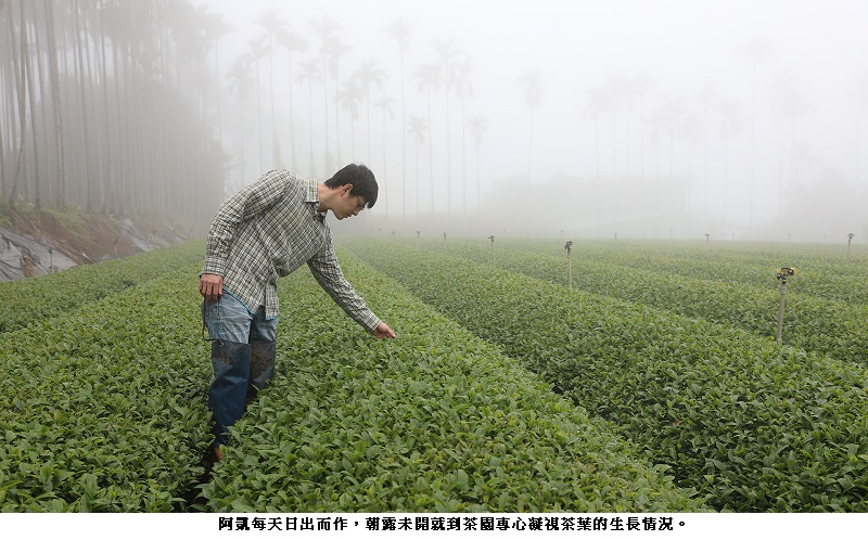 「比一些人早起步先走一步」是市場不敗的哲學,「機會永遠留給先準備好的人」。阿凱不煙不酒,日出而作,忙完茶園農作,就愛搖壼磨罐,品茗自種的茶葉,磨穿鐵硯自精通,喝著喝著,他已略懂中華茶道。