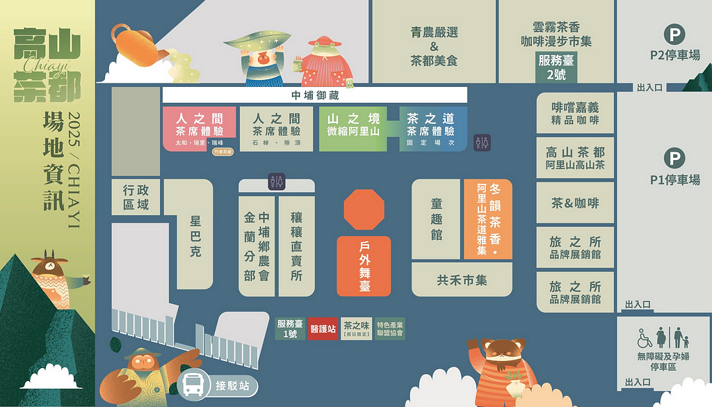 2025「高山茶都.嘉義」活動規劃「人之間、山之境、茶之道、旅之所、茶之味」五大展區,穀倉星巴克前的「茶引山行」入口意象區,用山間小徑,以綠意與光影,引領民眾走進園區感受嘉義山林的氣息。
