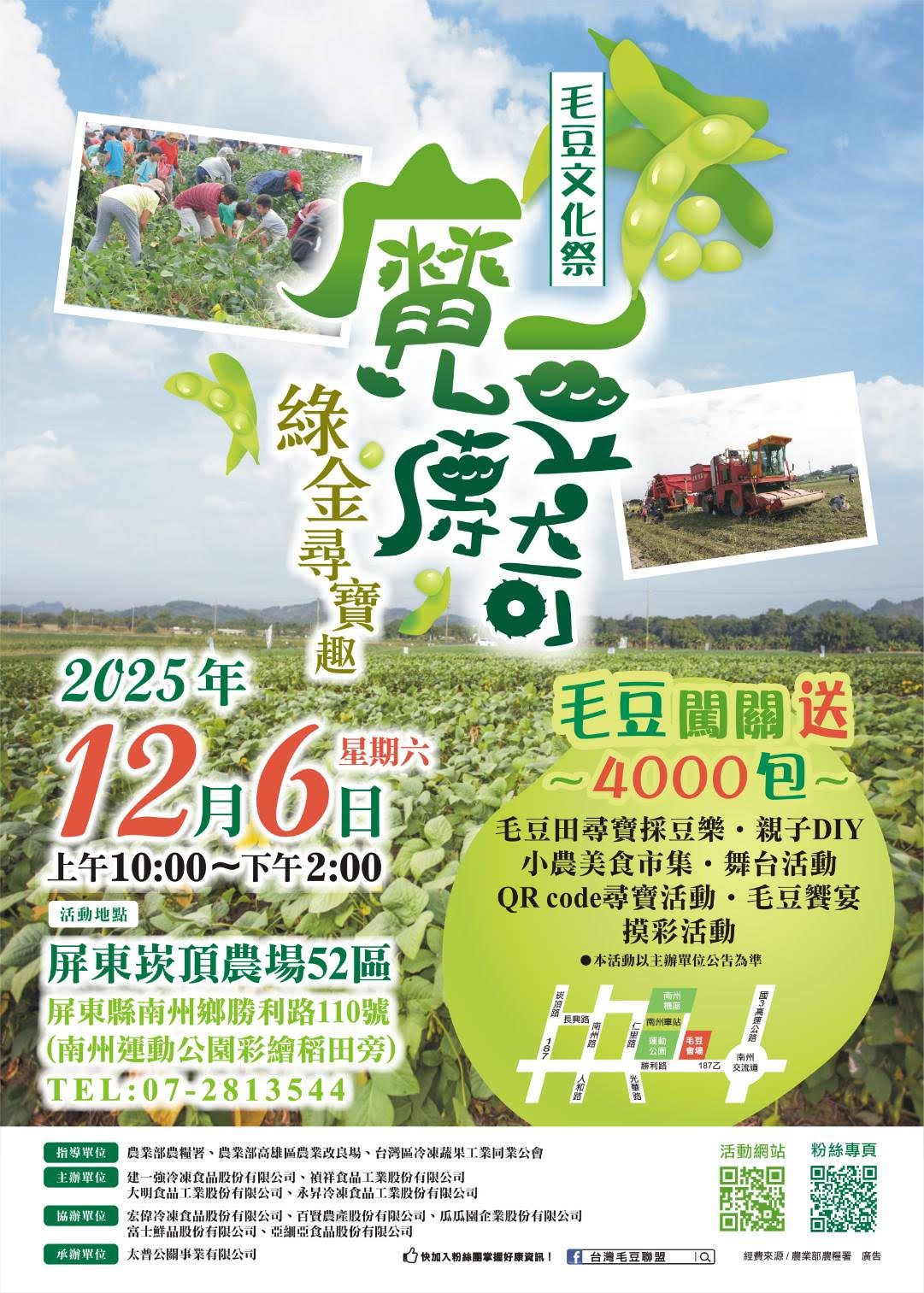 【記者戴英薇/高雄報導】 農業部農糧署與台灣區冷凍蔬果工業同業公會,本(26)日共同在高雄圓山大飯店舉行記者會,宣布去年停辦的毛豆文化祭「魔豆傳奇」活動,今年訂在12月6日恢復舉辦,並且移師到屏東縣南州鄉崁頂農場,重頭戲開放毛豆田讓民眾下田採毛豆、綠金尋寶趣,參加闖關可免費獲送毛豆,數量多達4000包,不需要報名,當天歡迎各地大小朋友一起來體驗下田採毛豆的樂趣!