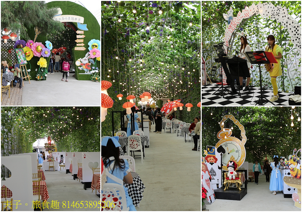 「中埔御藏」花隧道,在愛麗絲夢遊情境中,聽音樂、喝高山茶、喝咖啡、吃點心,最特別的是一份餐點200元,附蛋糕、高山茶或咖啡以及整組杯子、盤子都是你的。