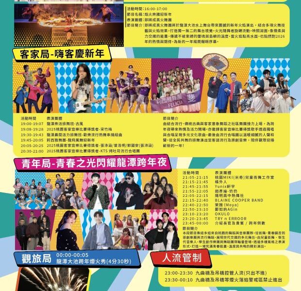 晚間7時則由客家局「嗨客慶新年」登場,由結合流行、傳統古典與客家意象之在地龍潭樂活排舞班、龍潭晨間活力排舞班與莉西雅舞團開場,後續邀請客家音樂比賽得獎歌手宋竹梅、張沛涵、曾浩明及郭國安,透過獨唱與合唱呈現多元文化歌曲,本段節目尾聲由KTS 烤吐司流行合唱團,帶來三首原創客語作品,以流行音樂與阿卡貝拉詮釋客家音樂,呈現客家歌曲不同樣貌;青年局將於晚間9時推出壓軸節目「青春之光閃耀龍潭跨年夜」,集結多組來自桃園的舞蹈與音樂團隊,從街舞、青春饒舌到原創樂團與流行舞蹈,展現世代交織的多元舞台,由兒童街舞、新生代音樂人、學生創作樂團與舞蹈團隊輪番登場,透過多樣風格之表演形式,以年輕的活力與熱情,陪伴現場民眾一起倒數,在璀璨的煙火中迎接新的開始。