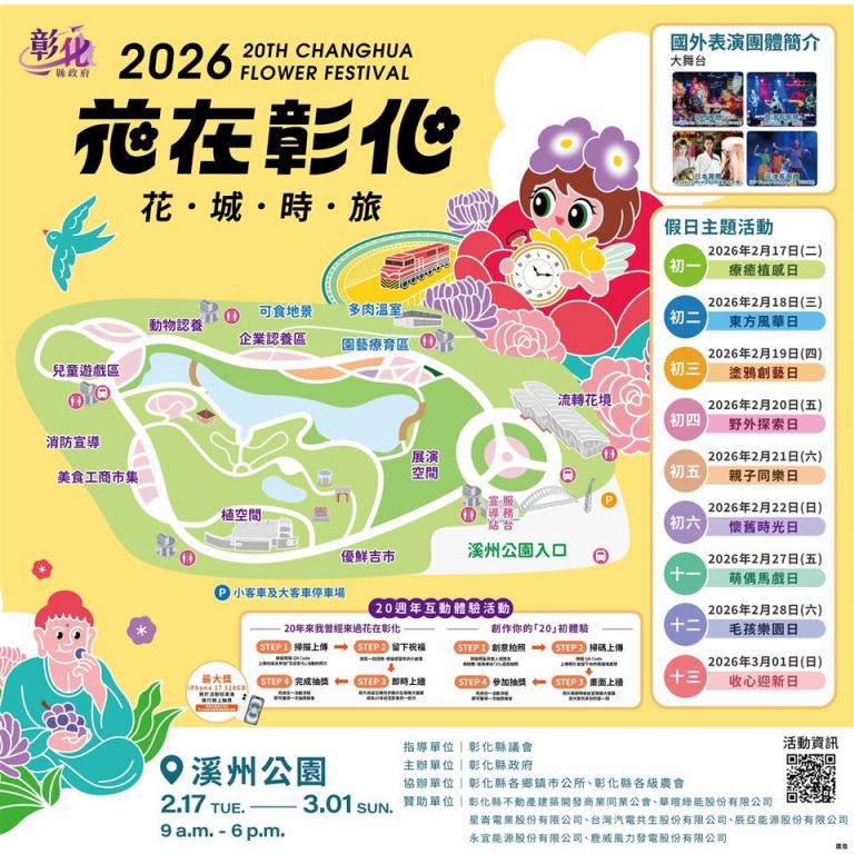 「2026花在彰化」17日在溪州公園盛大開幕,由縣長王惠美親自主持。活動持續到3月1日,共13天,每天上午9時至下午6時免費入園,帶領大家走入「花城時旅」的夢幻世界。王縣長表示,「花在彰化」原本是為行銷田尾及永靖等花草苗木的地方活動,20年來一步步走向全台走春第一品牌,帶來龐大觀光效益。這次「花在彰化」主題是「花城時旅」,將20年來的情感、記憶以及對未來的想像融入,成為一場跨越時空的花海盛宴。邀請鄉親一起回娘家,在難忘的旅行中創造更多回憶。