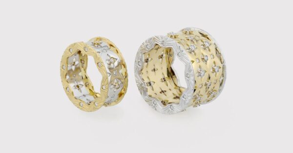 本次展覽中,最受矚目的作品之一,莫過於耗時超過半年的「百花系列」。其中的雙層百花戒,共鑲嵌六十三顆鑽石、隱藏著一百二十六個焊接點,並以18K金與黃金交錯構成複雜結構。其戒指內圈更顛覆傳統佛羅倫斯對戒,以放射狀星芒設計減少戒指與手指的接觸面積,使看似量體偏大的戒指,在配戴時依然舒適輕盈。