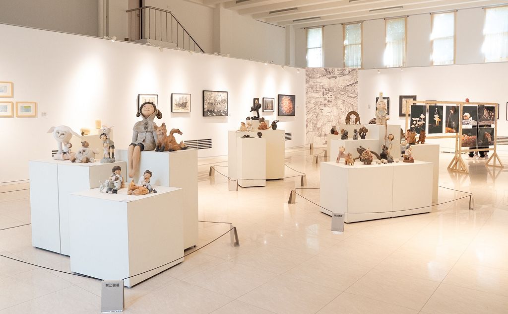 多次獲全國學生美術比賽獎項肯定的劉證宇,擅長以平面繪畫與雕塑記錄心中的巨大世界,作品《壓縮》系列巧妙運用密集線條、符號與立體造形組構出可供行走的建築空間,如同壓縮視角下生成的城市模型。《海洋》系列中,黃色小鴨與奇幻生物游弋於透亮的藍色深處,呈現安靜又通透的想像場景。