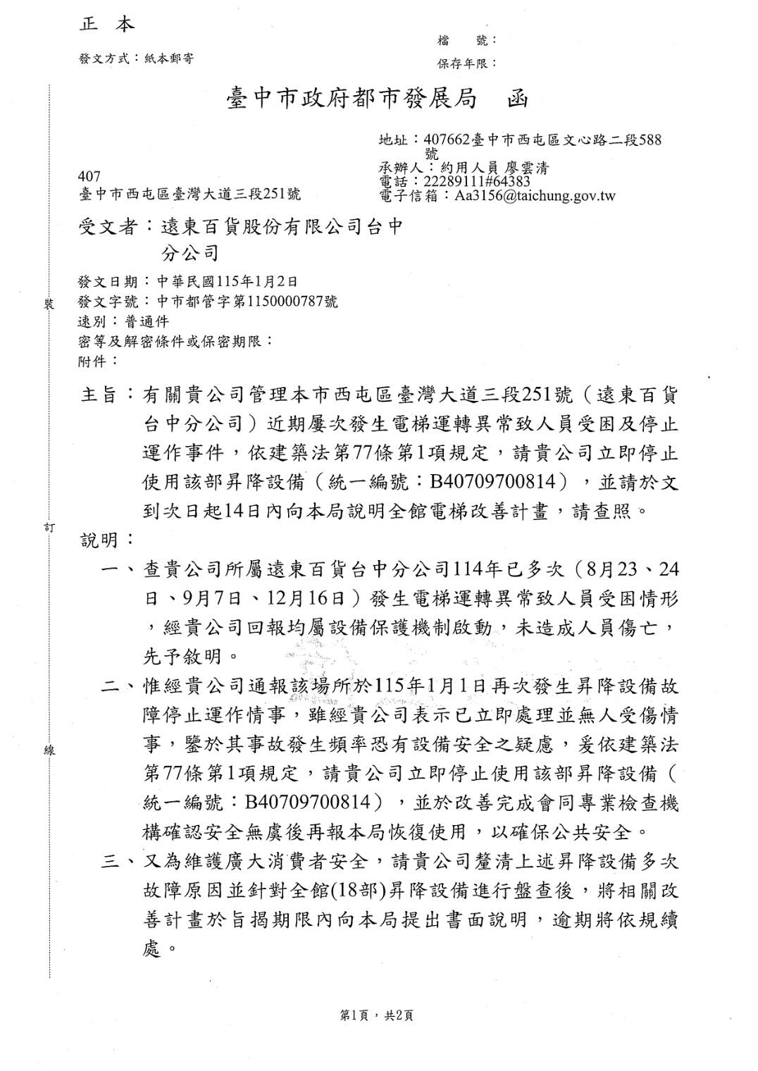 遠東百貨台中分店昨(1)日晚間發生電梯公安事件,館內編號11電梯因故障造成人員短暫受困,經維護保養廠商蒂升電梯公司會同百貨設備人員到場處理後,受困人員均已安全脫困,無人受傷;事故原因目前仍由業者及專業維修廠商持續檢查釐清中。台中市政府都市發展局表示,經派員前往現場稽查,已依《建築法》第77條第1項規定,勒令該電梯停止使用並限期改善,除已依法張貼「停止使用」告示,也要求業者善盡管理與維護責任,待改善完成並報請都發局核備後,才可恢復使用。