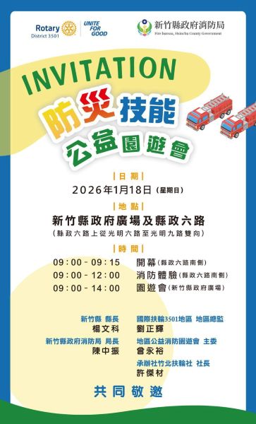 新竹縣消防局為提升民眾防災知能,將防災教育落實於日常生活,攜手國際扶輪3501地區將於1月18(日)日上午8時至下午2時,於縣府廣場及縣政六路舉辦「防災技能公益園遊會」,邀請民眾透過實際體驗方式,學習正確的防災與救護技能。