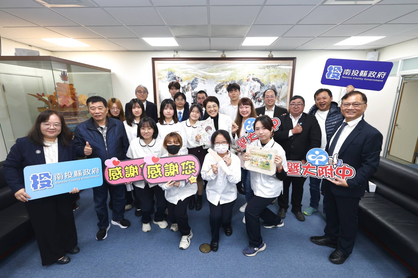 暨大附中學生團隊向南投縣長許淑華簡報國際得獎作品,展現跨域科研成果。