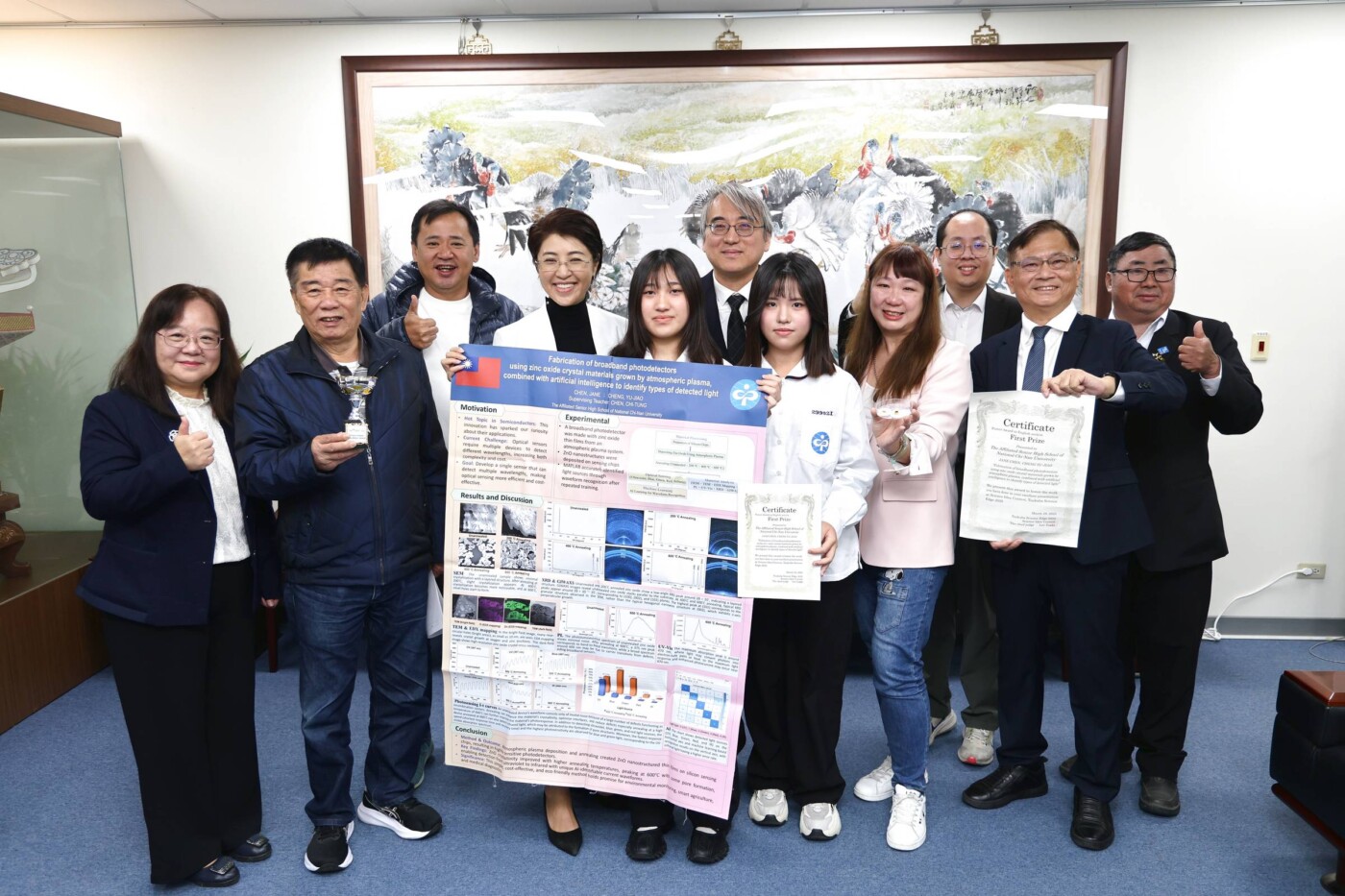 在科技領域,團隊以「大氣電漿技術結合 AI 人工智慧之氧化鋅寬頻光感測器」,奪下日本筑波科學競賽英語組第一名,以及日本靜岡 SKYSEF 海報傑出獎,展現結合 AI 與光電感測的創新能力。